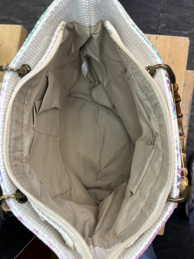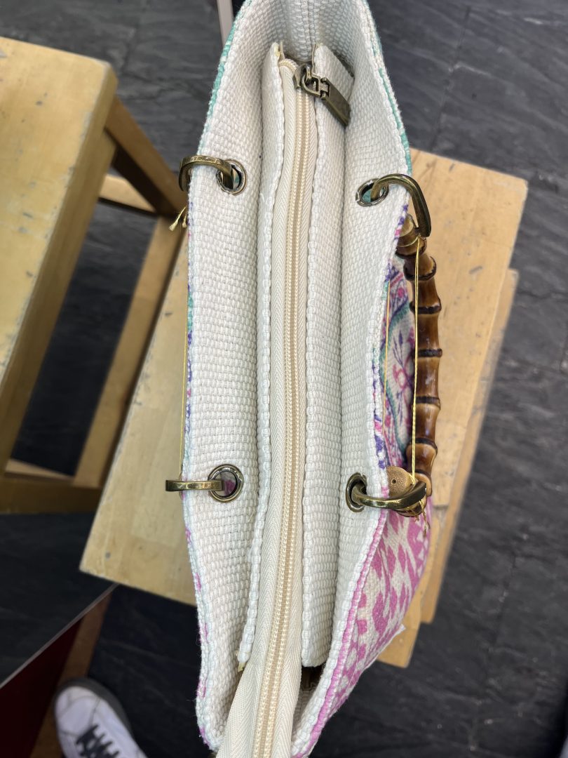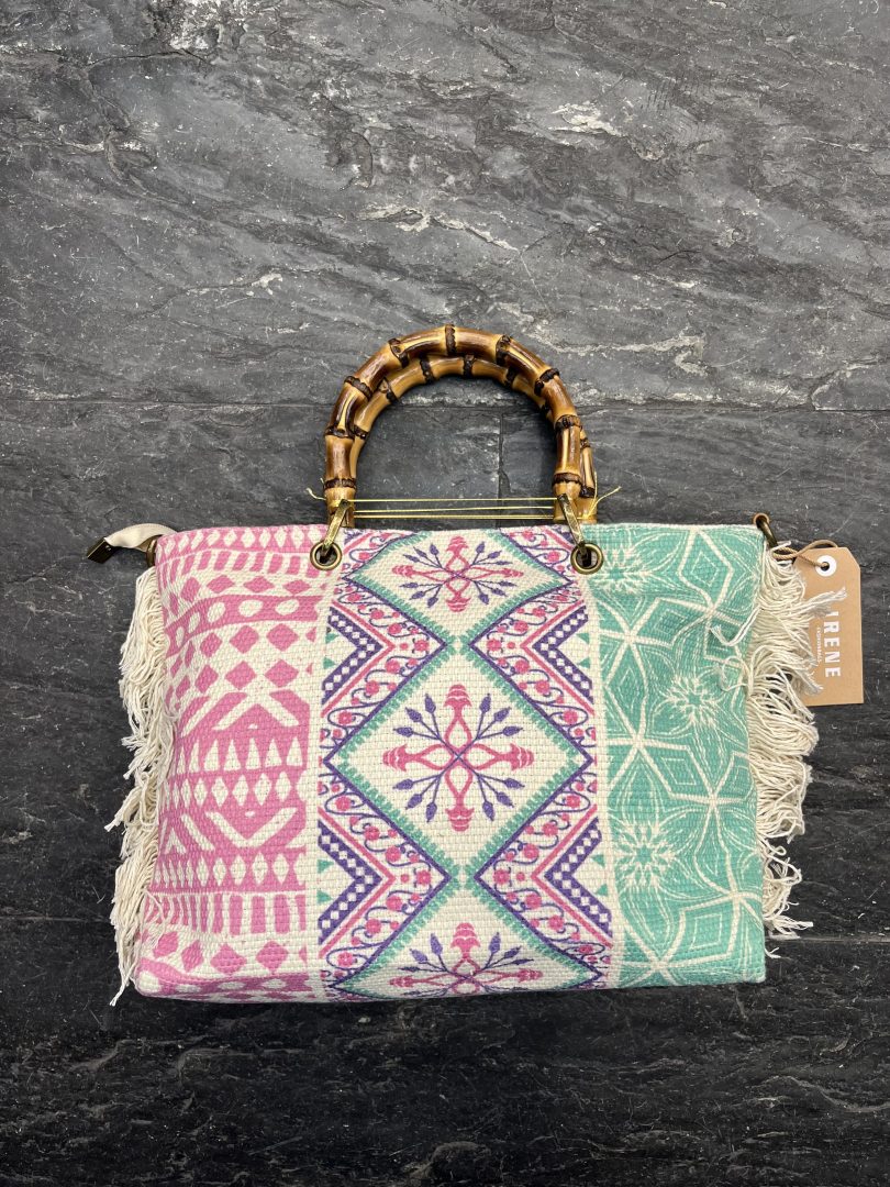 Bolso de algodón multicolor con asas de madera, asa larga regulable, cierre de cremallera e interior forrado con bolsillo.