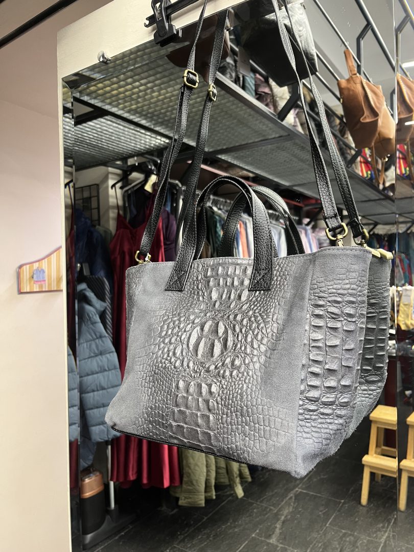 Bolso básico de piel color gris con relieve grabado. Incluye asa corta y correa larga ambas de piel. Cierre de cremallera e interior forrado con bolsillo interior con cremallera.
