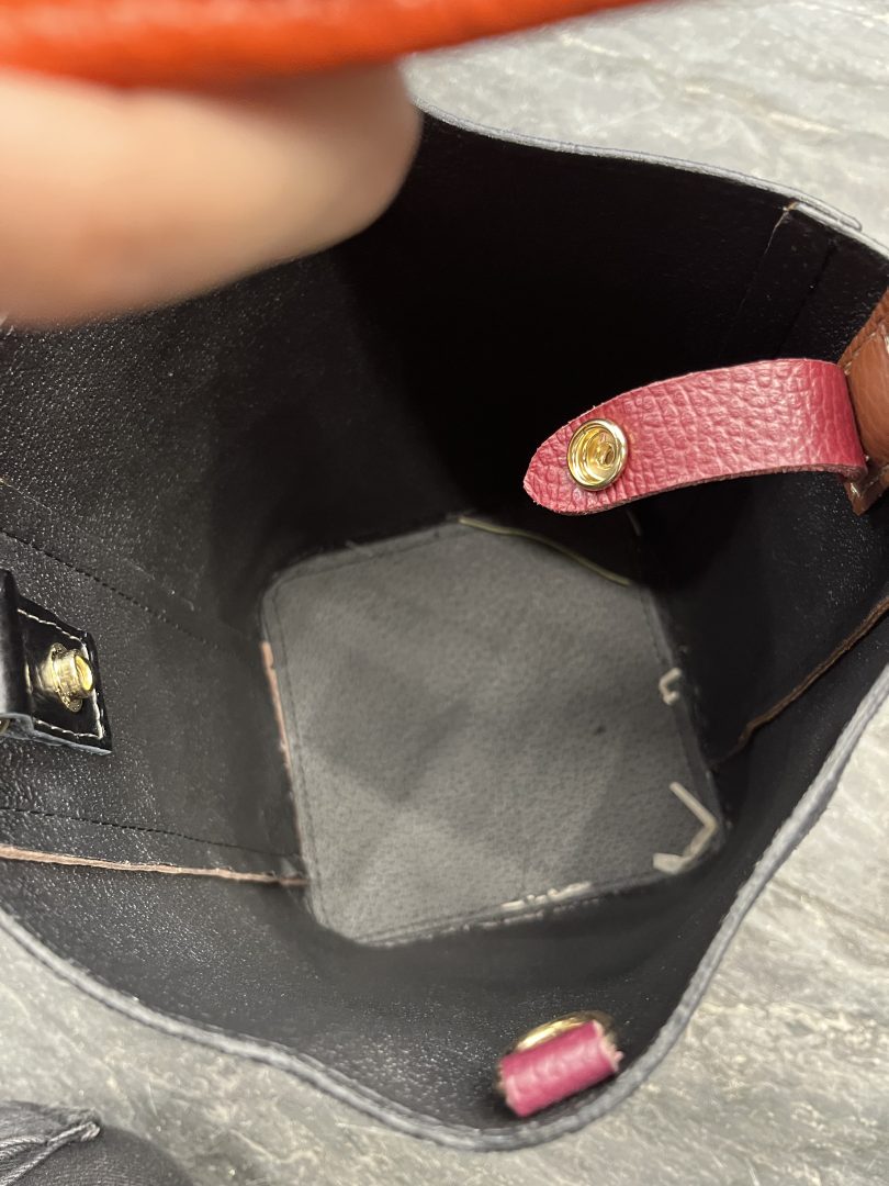 Bolso tipo bombonera confeccionado en piel auténtica multicolor, diseñado para combinar estilo y funcionalidad.