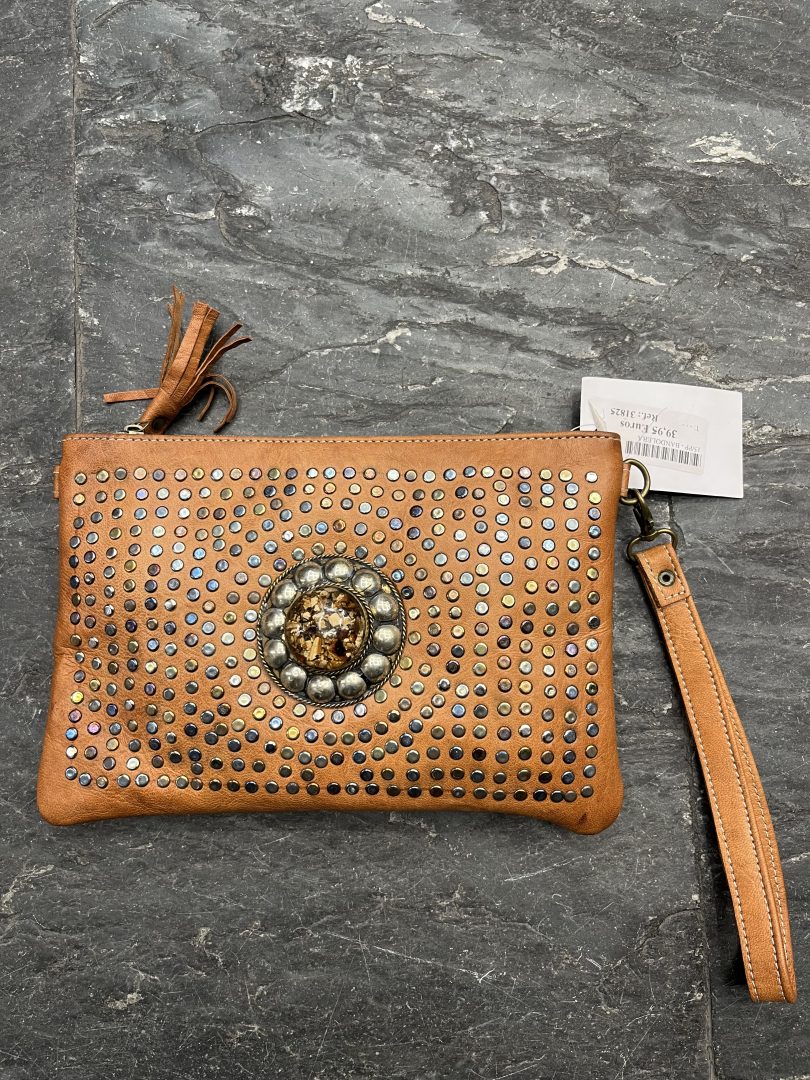 Bolso de cuero artesanal elaborado con piel natural, decorado con una esmeralda central y tachas metálicas que le aportan un estilo único y con carácter. Incluye correa larga de cuero para llevar al hombro o cruzado.