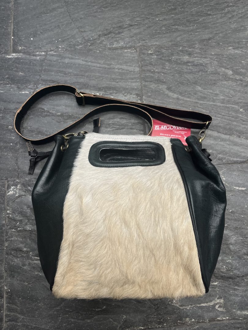 Bolso de cuero negro con piel de potro hecho a mano, diseñado de forma artesanal y con una combinación de materiales naturales que lo convierten en una pieza única.