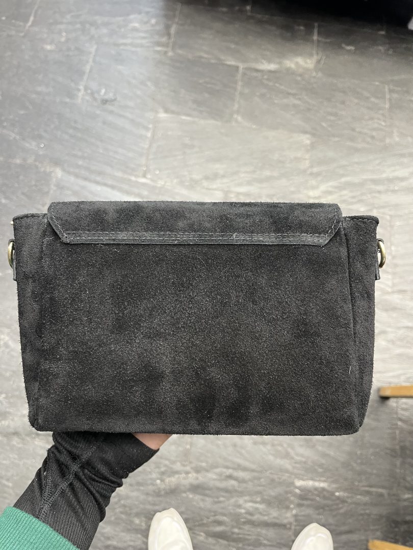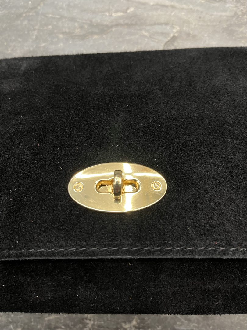 El Bolso de Piel Negro Serraje con Solapa y Cierre Giratorio presenta un diseño compacto y estructurado en piel tipo serraje de textura suave.