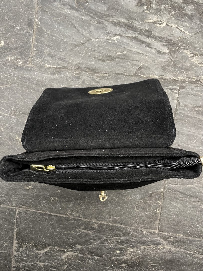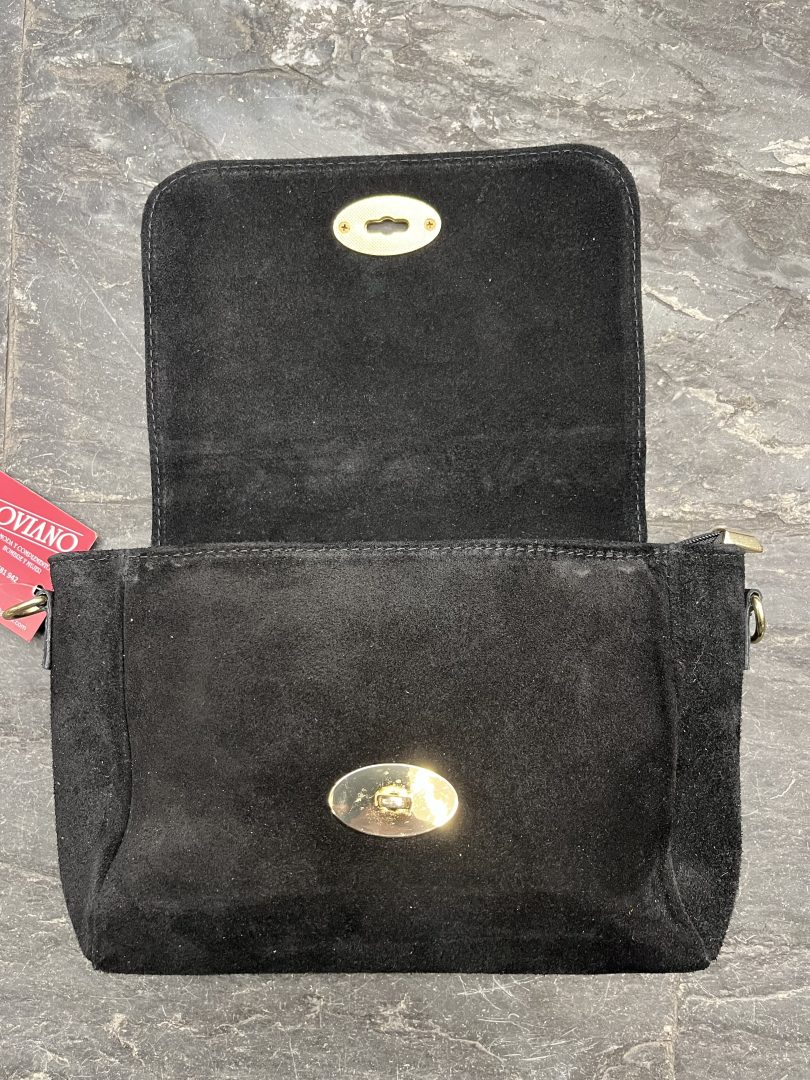 Incluye correa larga de piel con mosquetones metálicos, permitiendo llevar el Bolso de Piel Negro Serraje con Solapa y Cierre Giratorio cruzado o al hombro.