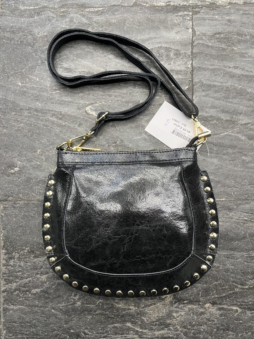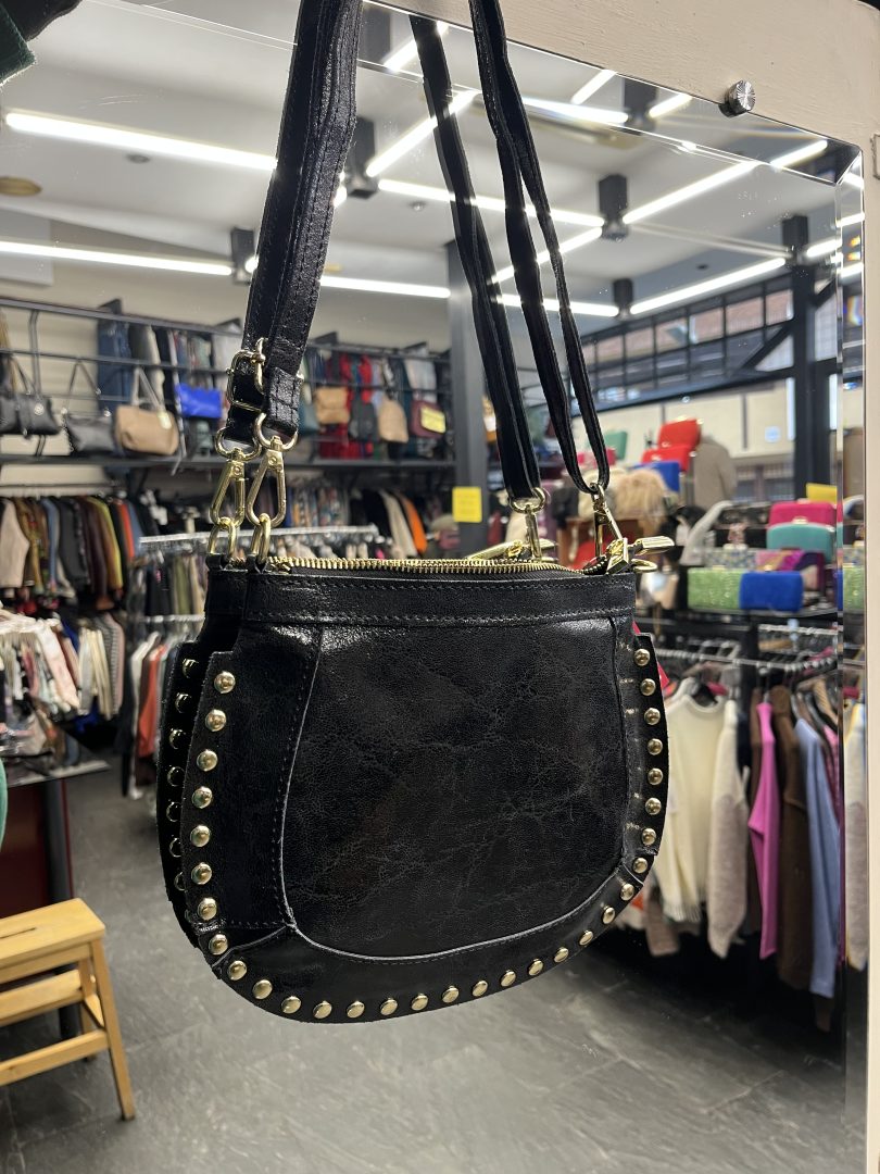El Bolso de Piel Negro Redondeado con Tachas destaca por su diseño compacto con base curva que aporta un estilo moderno y equilibrado. La piel presenta un acabado ligeramente brillante con efecto natural.