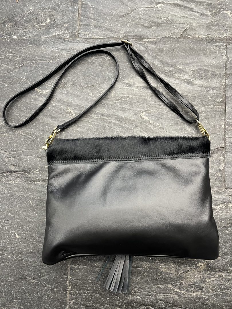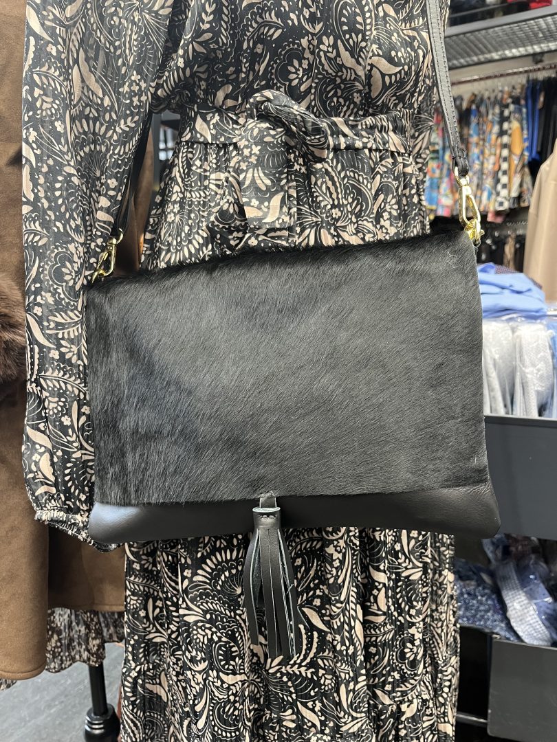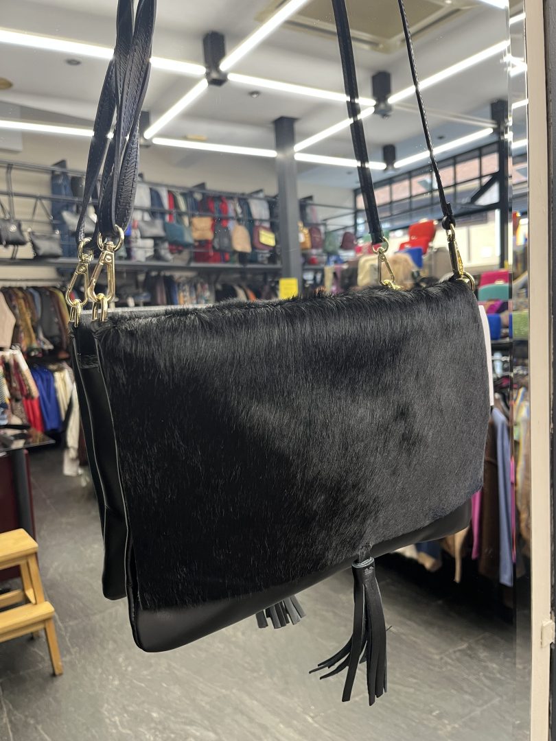 Bolso de Piel combinado con Pelo de Potro Natural en la solapa, diseñado para aportar textura y sofisticación a cualquier look. Incorpora detalle de fleco frontal que añade movimiento y personalidad.