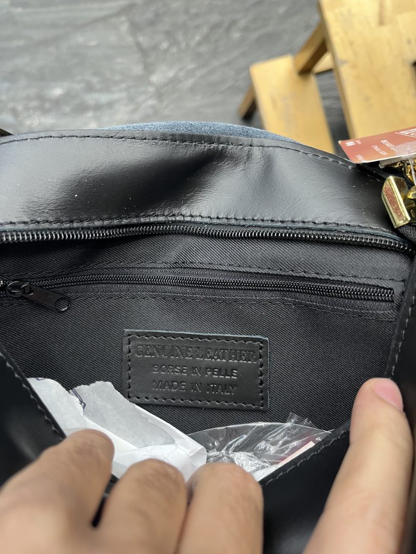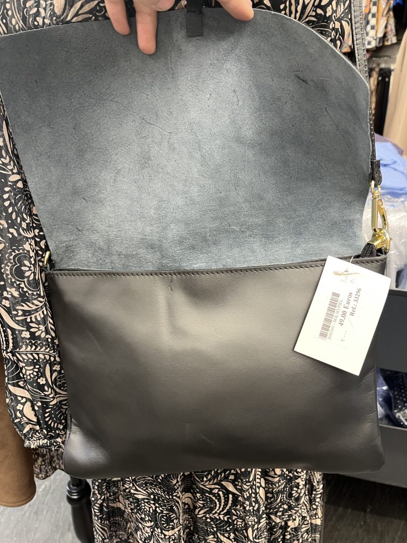 Dispone de correa larga de piel para llevar al hombro o cruzado. Interior completamente forrado con bolsillo con cremallera para una mejor organización.