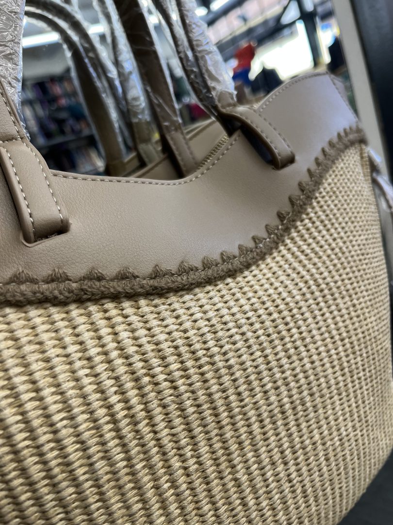 Bolso de rafia combinado con polipiel en color camel, un modelo de estilo natural y elegante que combina fácilmente con todo. El contraste de materiales y su ligero bordado en crochet aportan un toque especial y muy favorecedor.