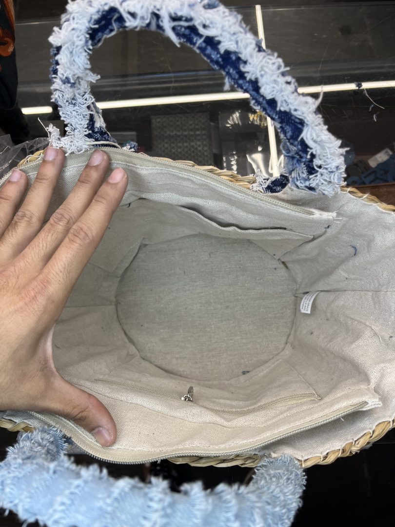 Bolso de rafia natural con un diseño original gracias a sus asas de tejido tipo denim deshilachado en tonos azules, que aportan un estilo desenfadado y muy actual.