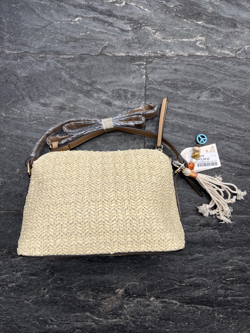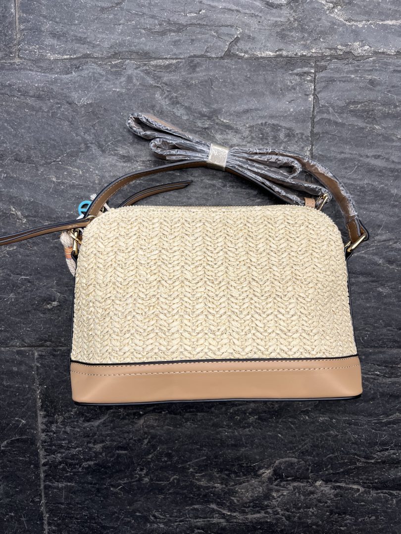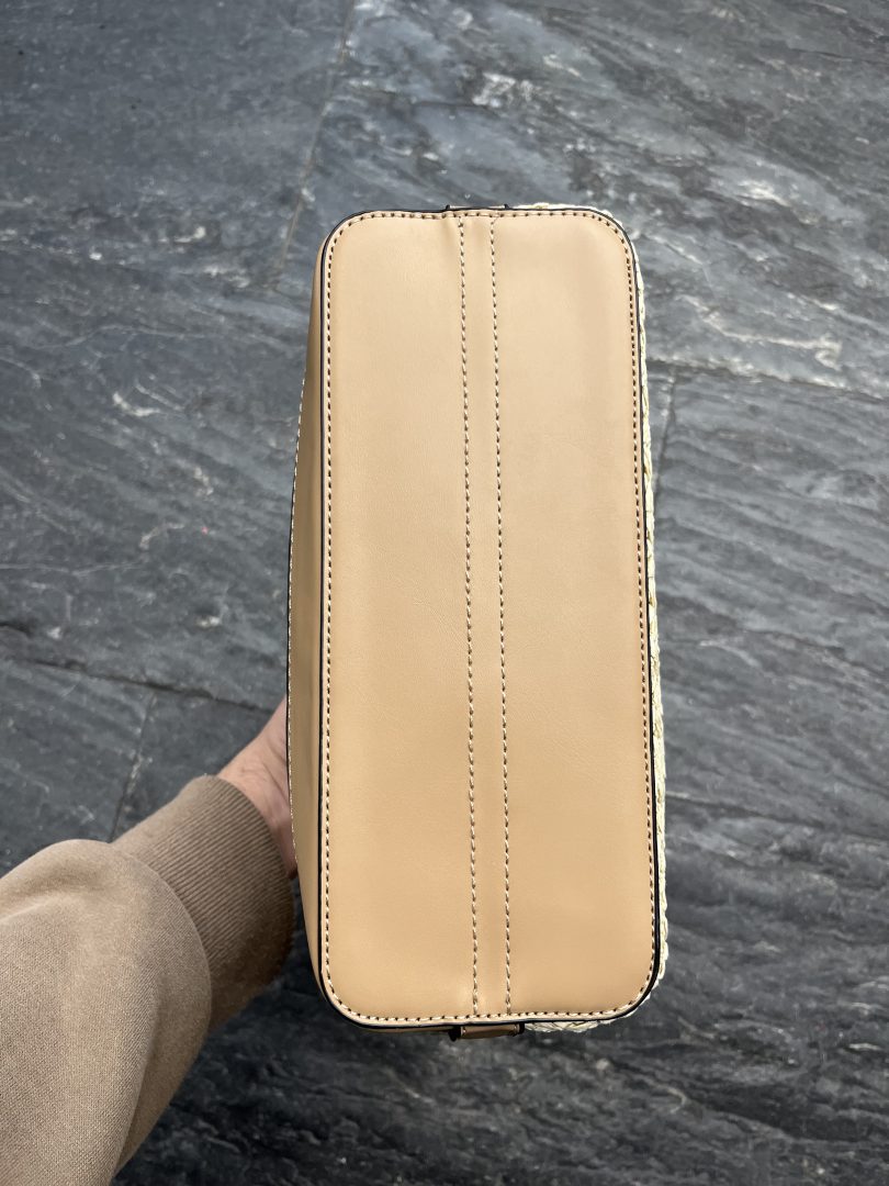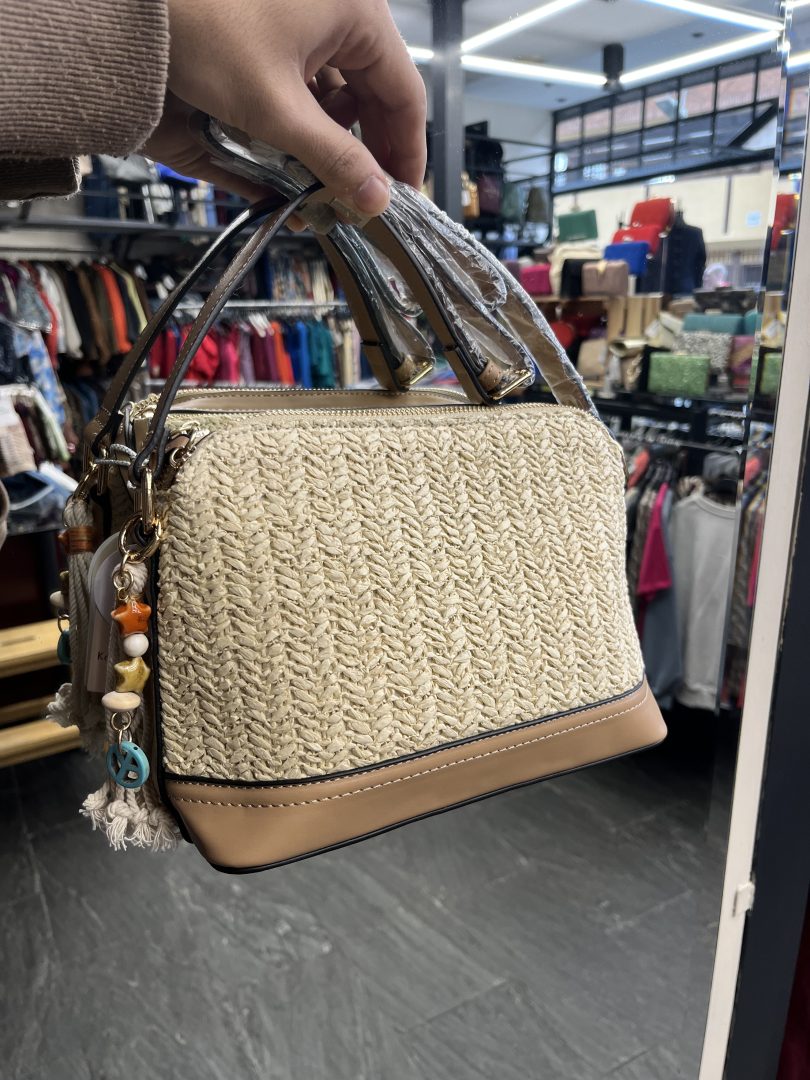 Bolso de rafia en tono natural con detalles en polipiel color camel, perfecto para un estilo veraniego elegante y funcional.