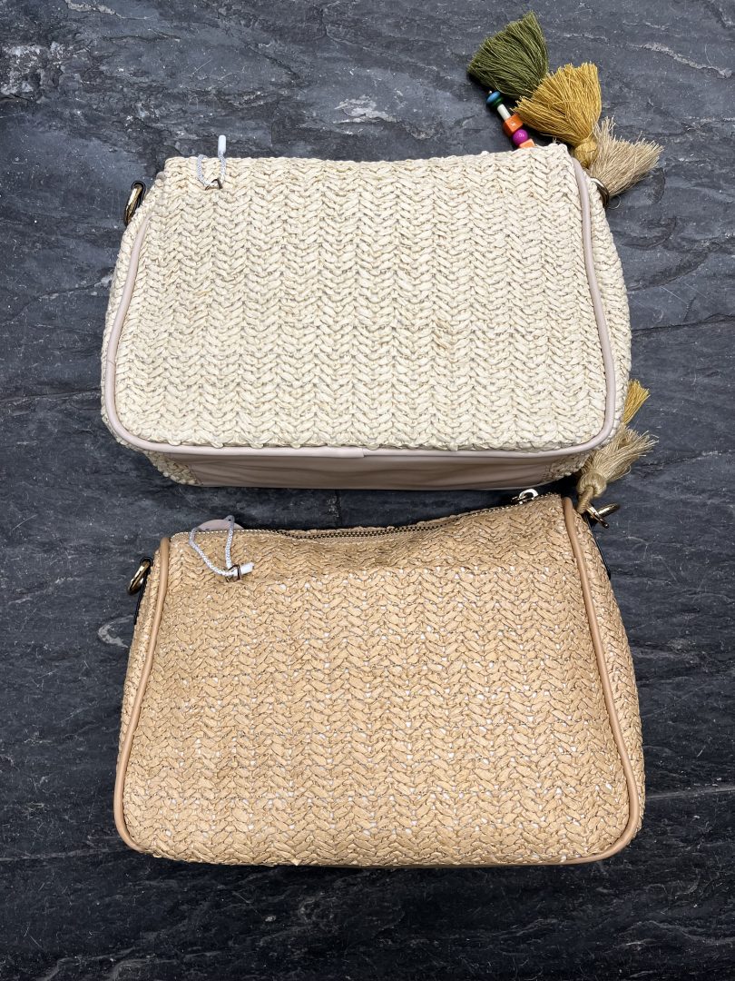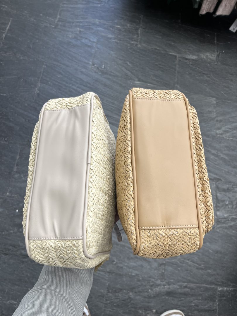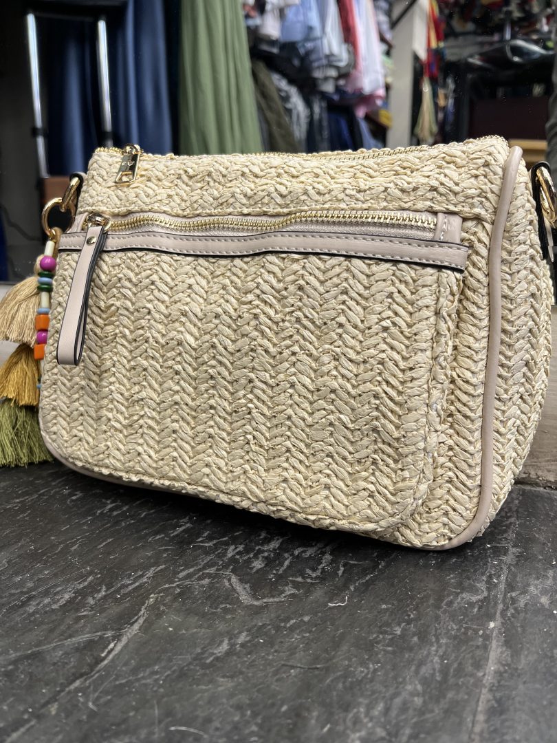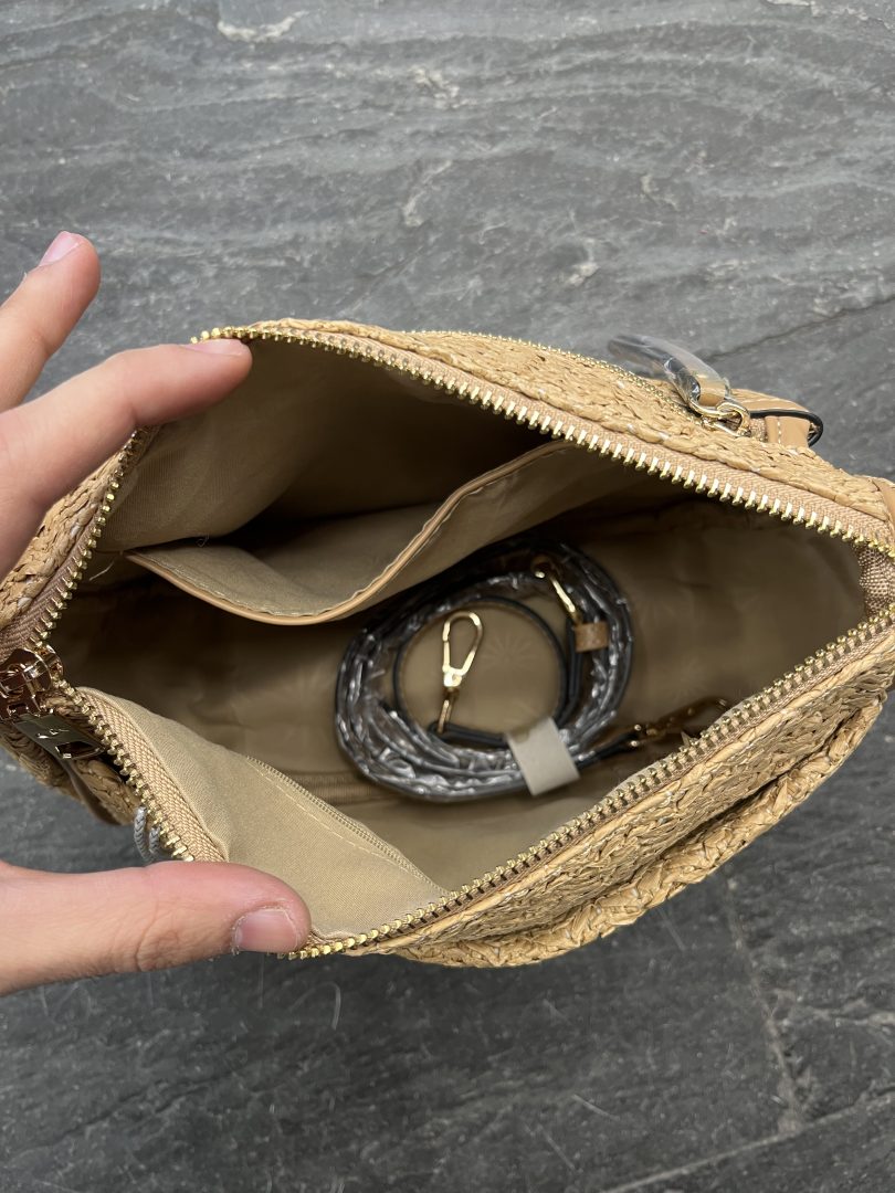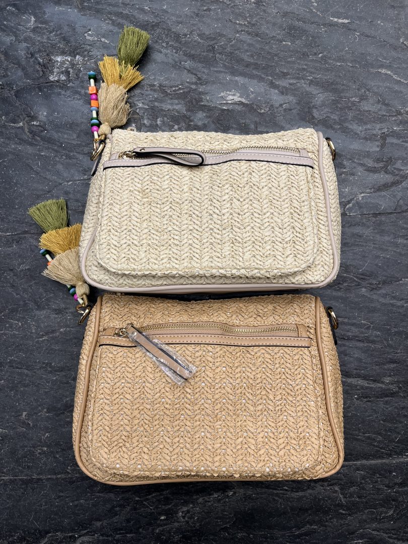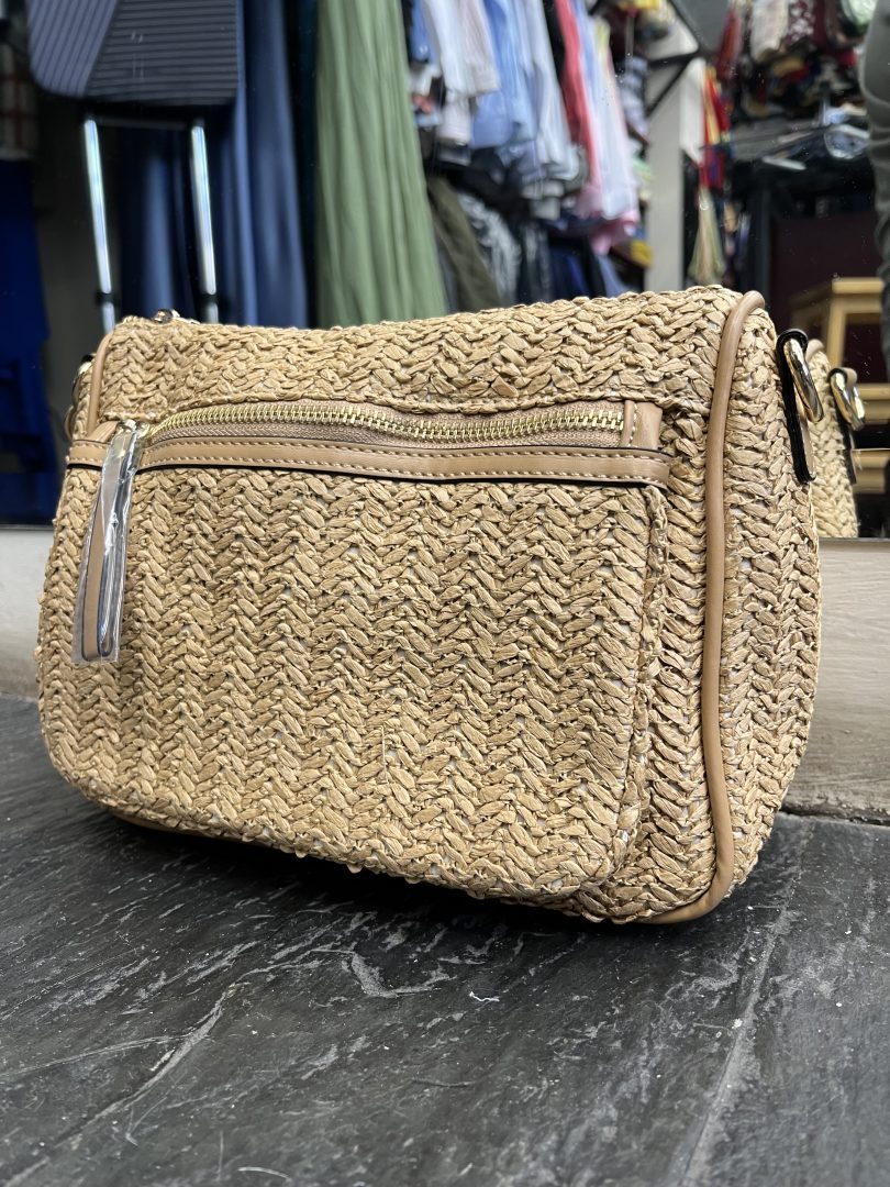 Bolso de rafia disponible en color beige y camel, perfecto para el día a día en temporada de verano. Su diseño incluye varios compartimentos independientes con cierre de cremallera, lo que permite una mejor organización.