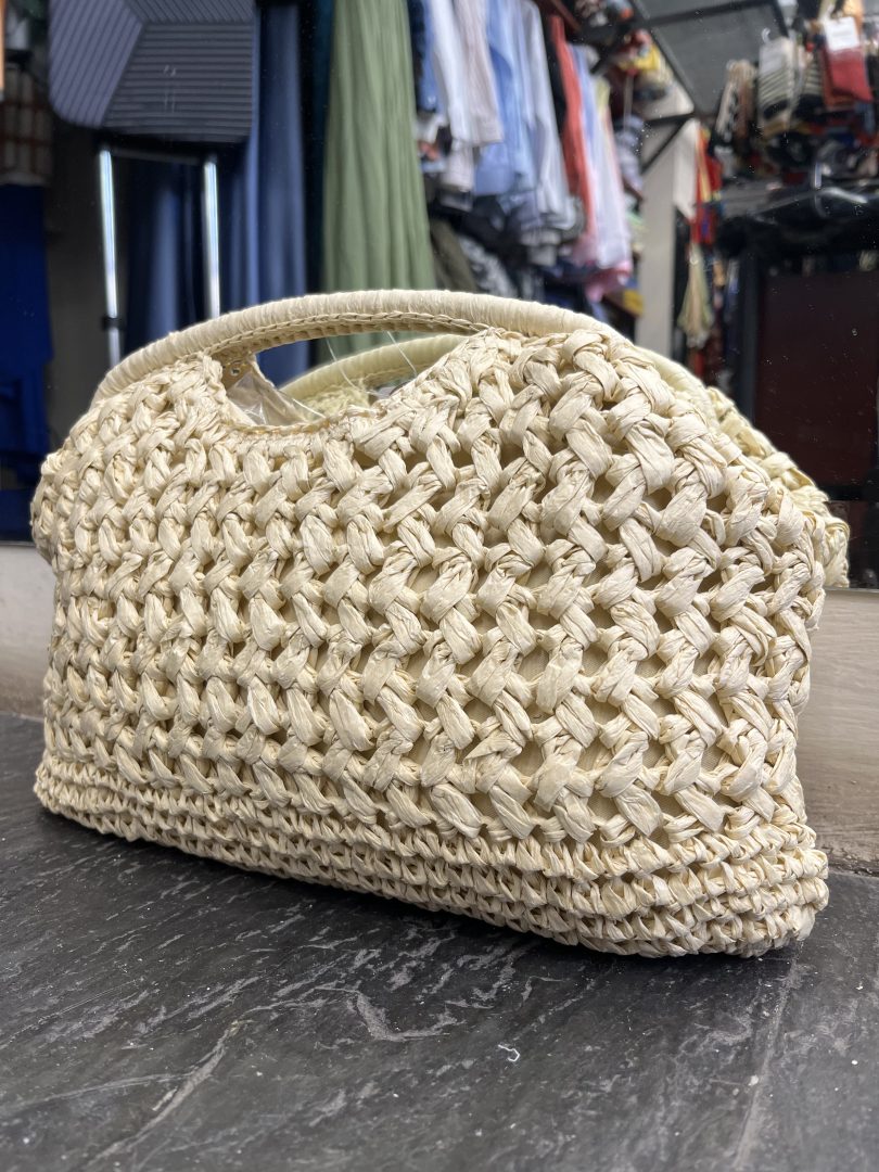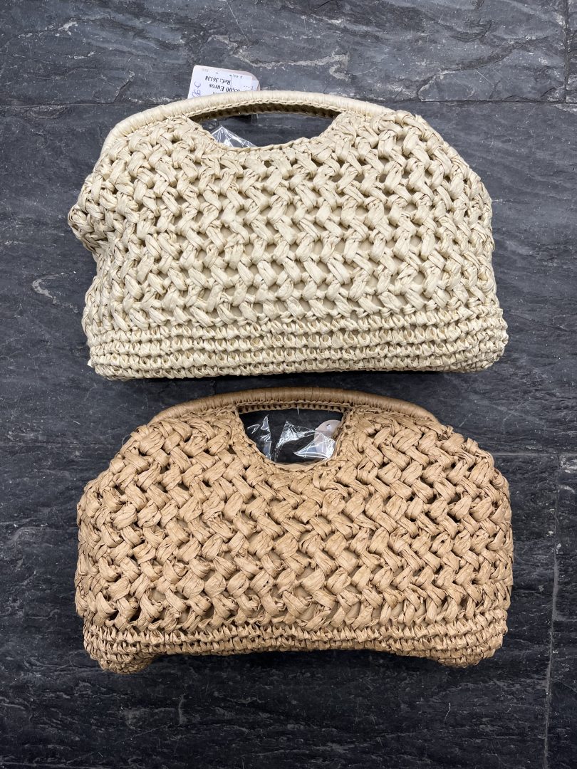 Bolso de rafia disponible en dos colores, beige y camel, con diseño natural ideal para verano. Incorpora correa larga de cadena para llevarlo cómodamente al hombro o cruzado.