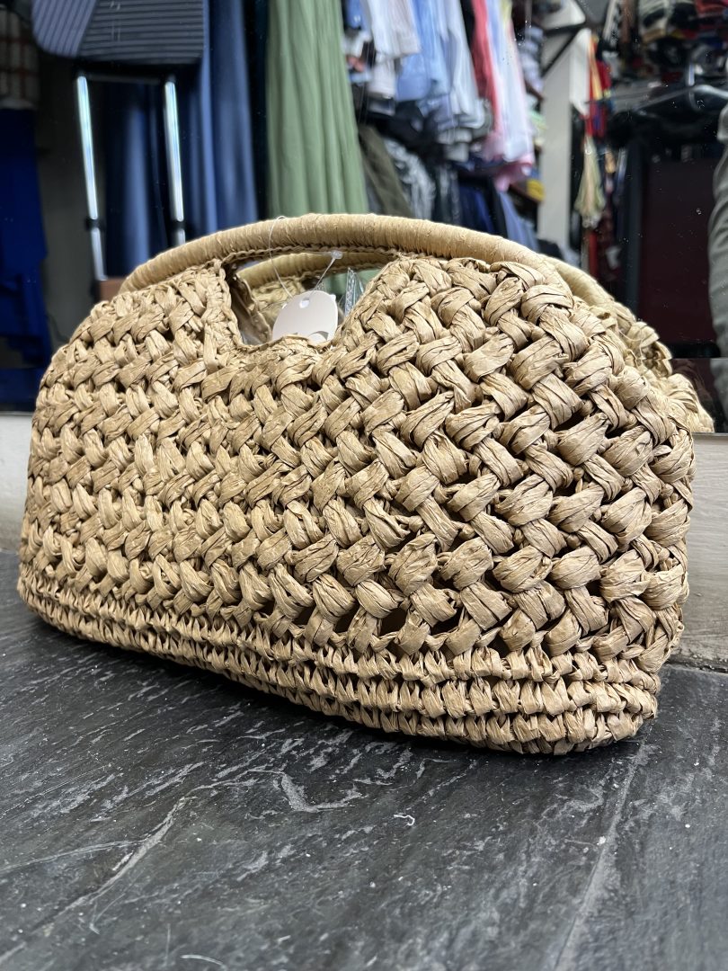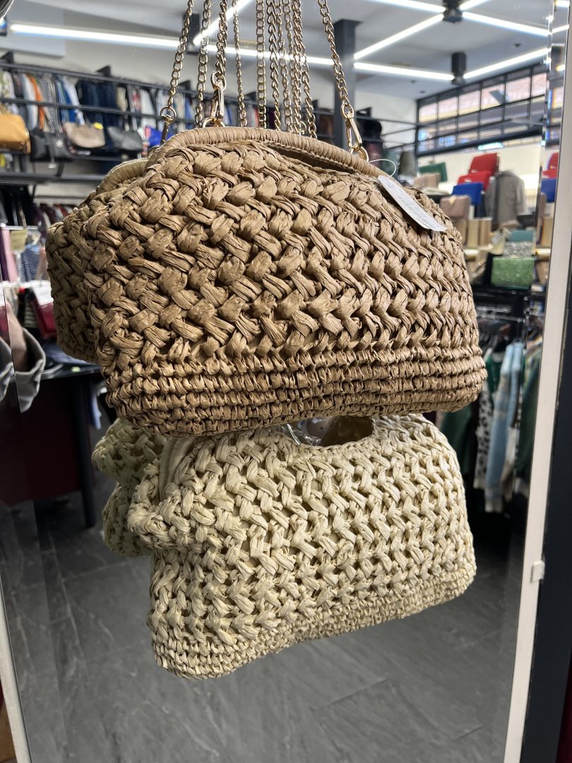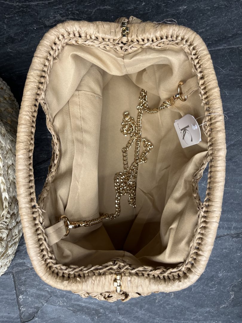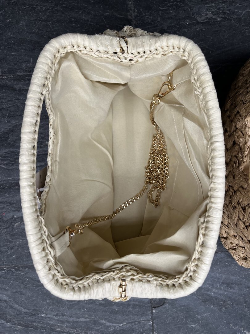 Bolso de rafia en beige o camel con cadena larga. Interior forrado con bolsillo y cierre tipo boquilla.