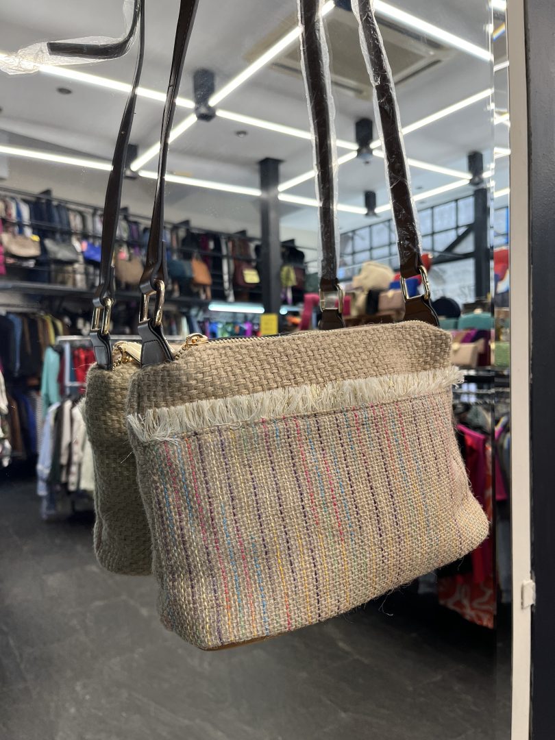 Bolso de rafia con diseño natural combinado con líneas multicolor que aportan un toque alegre, fresco y muy veraniego. Su acabado con flecos en la parte superior le da un estilo desenfadado y actual, ideal para looks casuales o de temporada.