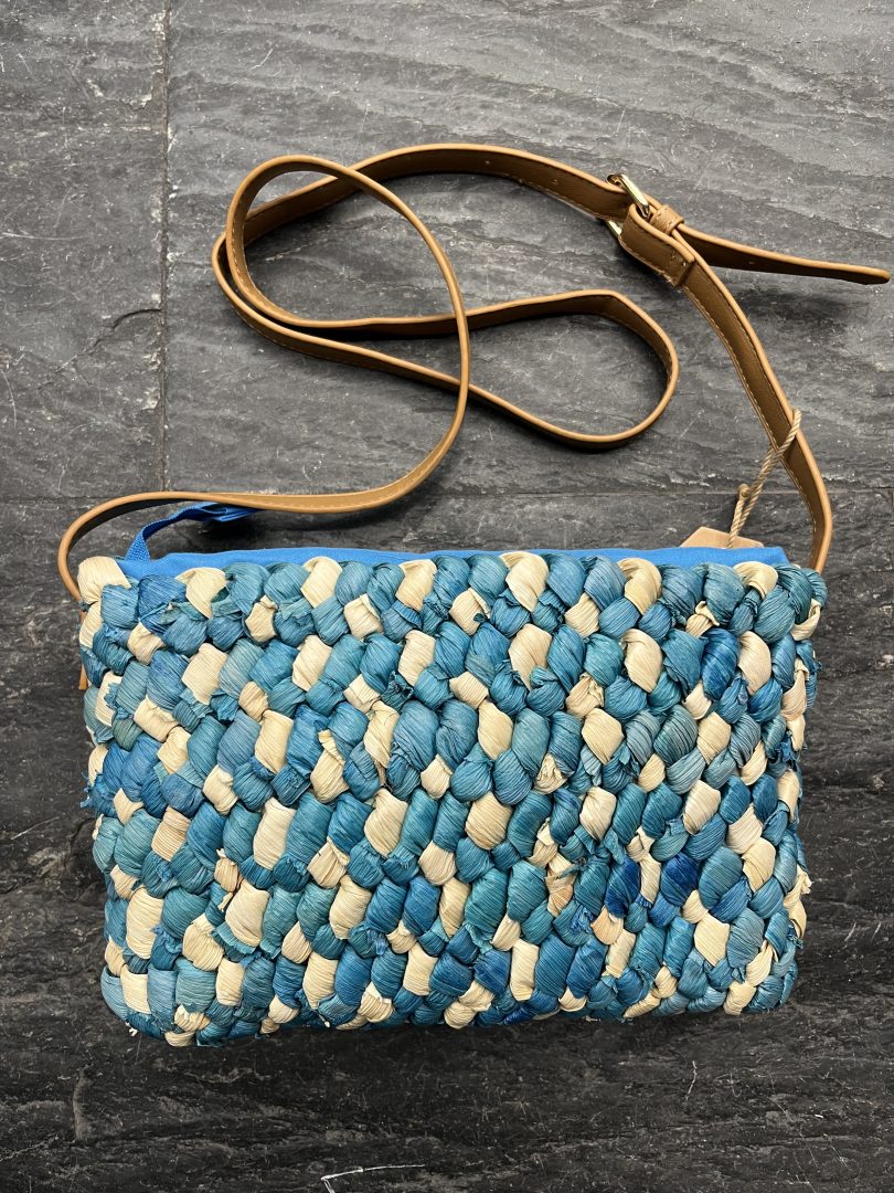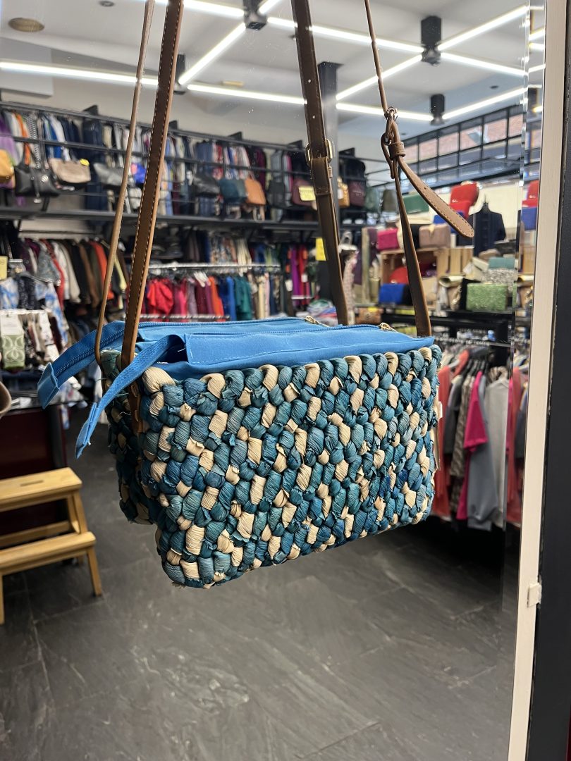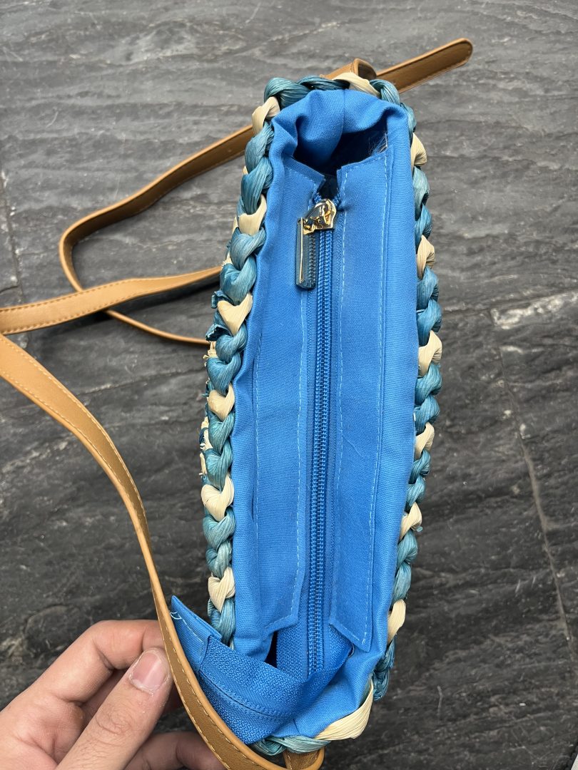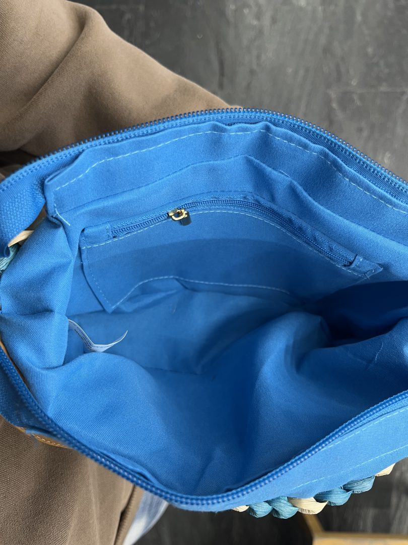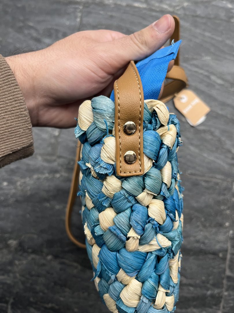 Bolso de rafia trenzada en combinación de tonos azul y beige, con un diseño fresco y llamativo ideal para la temporada primavera-verano.