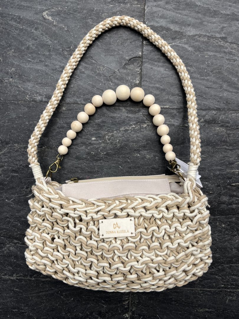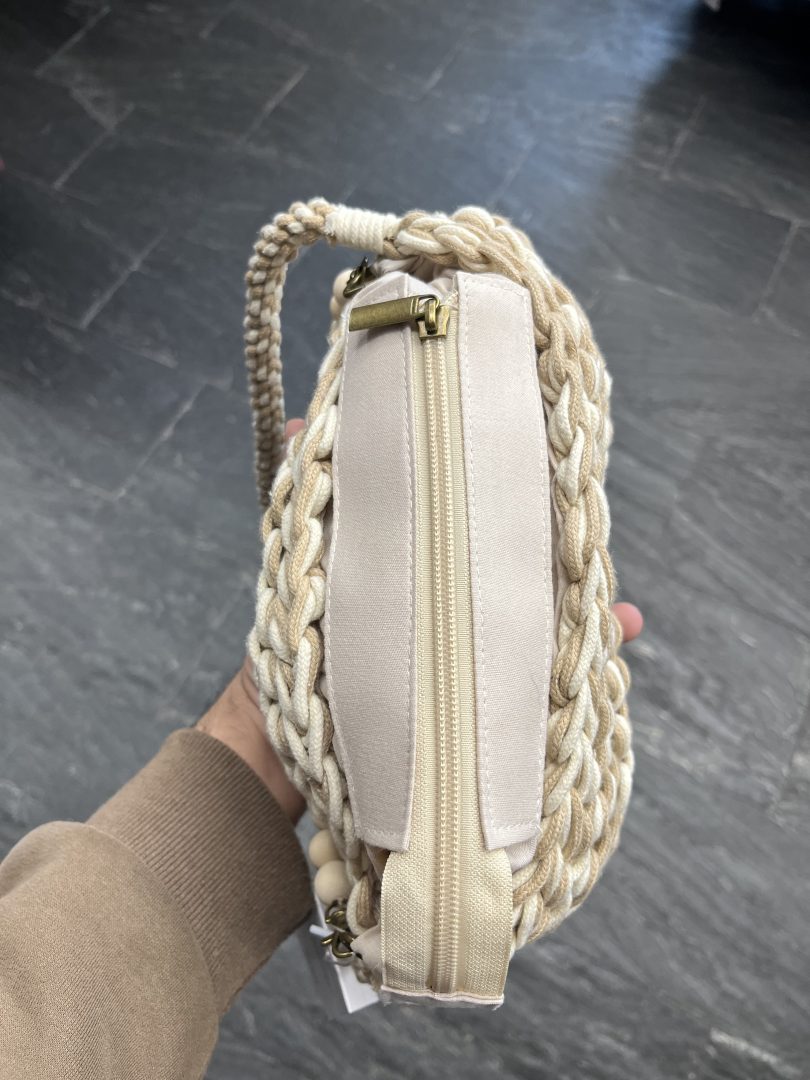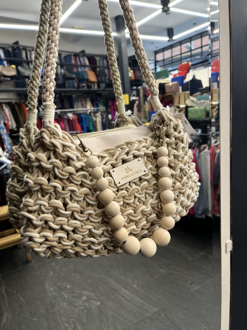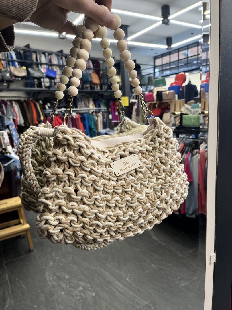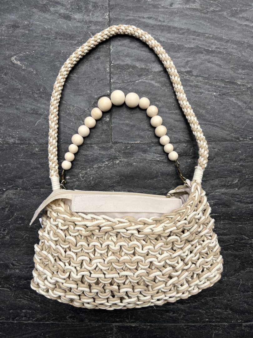 Bolso trenzado de algodón en tonos naturales, con un diseño artesanal que aporta un estilo boho y veraniego único.