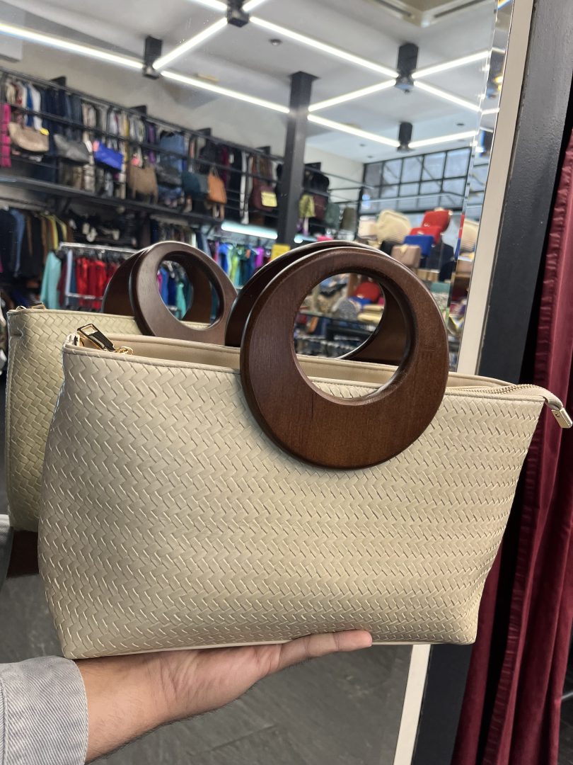 Destaca por sus asas integradas de madera, resistentes y cómodas, que le dan un aire sofisticado y original. Incluye cierre de cremallera para mayor seguridad y una correa larga de polipiel ajustable y desmontable, ideal para llevarlo también al hombro o cruzado.