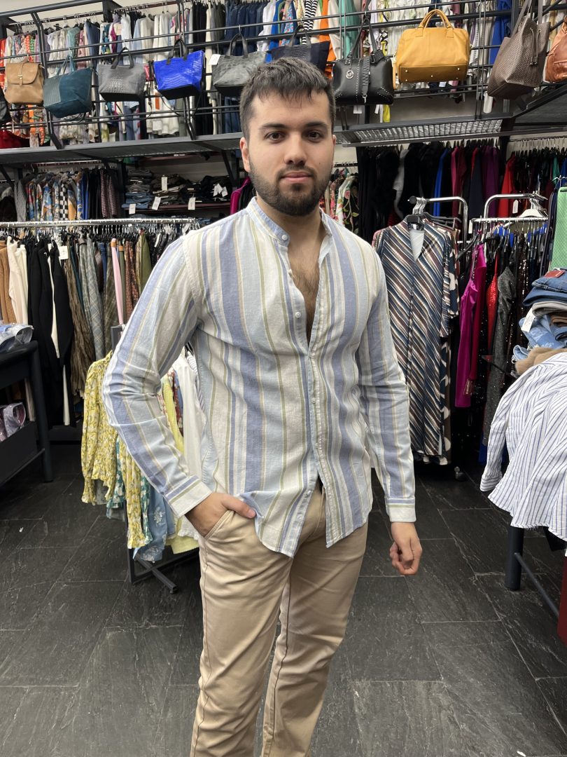 Esta camisa estilo azul con cuello mao destaca por su diseño elegante y ligero, perfecta para los meses cálidos.