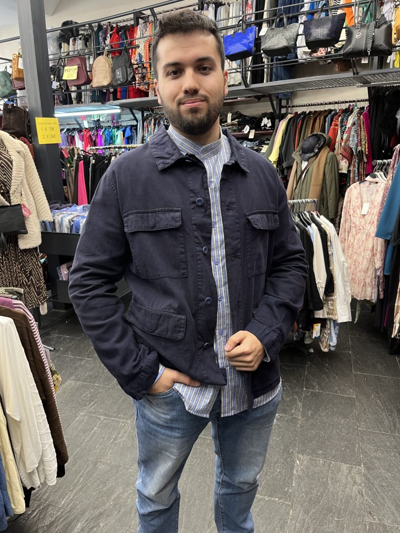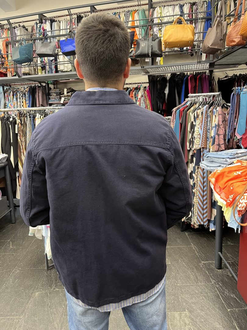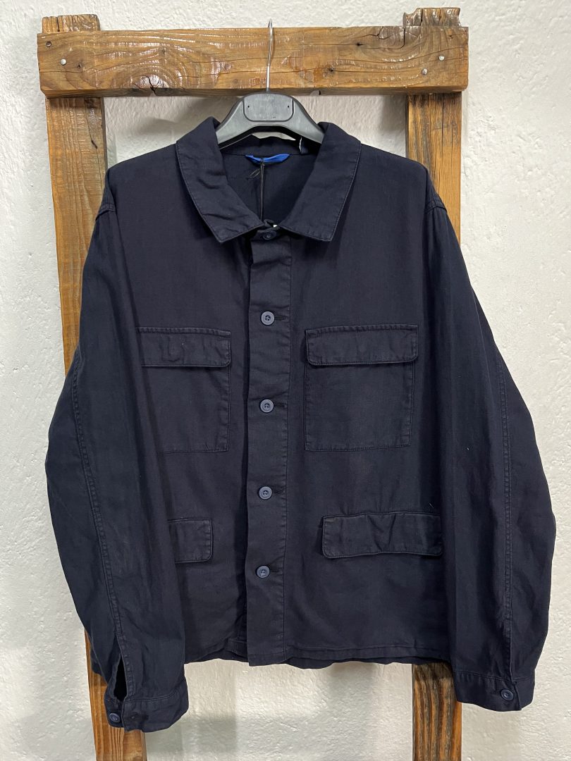 Esta chaqueta azul marino de lino y algodón combina estilo casual y funcionalidad en una prenda ligera y cómoda.