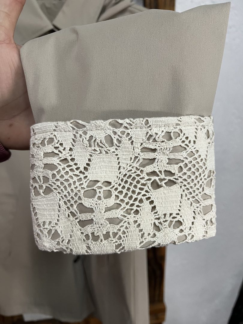 Gabardina beige de entretiempo con diseño elegante y funcional. Incorpora capucha desmontable y cierre frontal con botones. Destaca por su detalle de crochet en los puños, que aporta un toque especial y diferente.