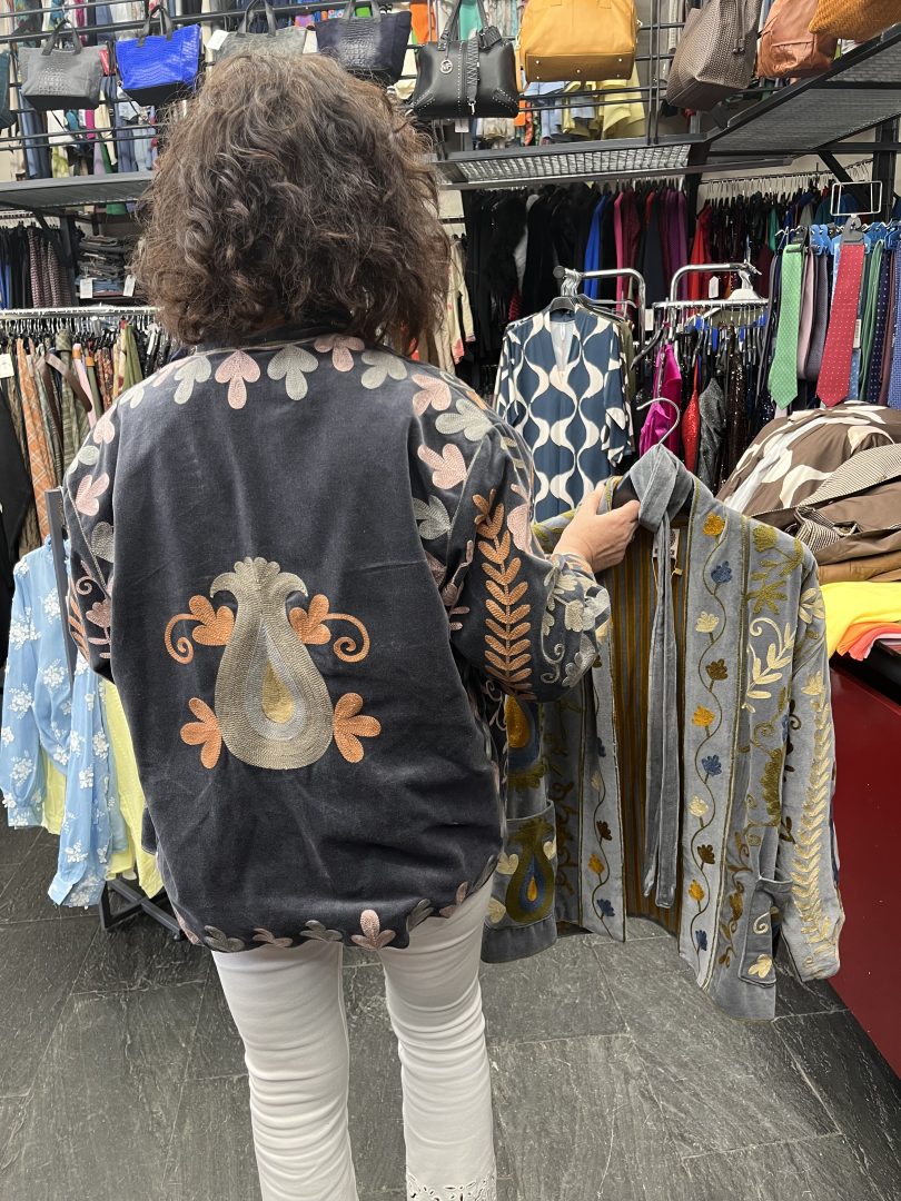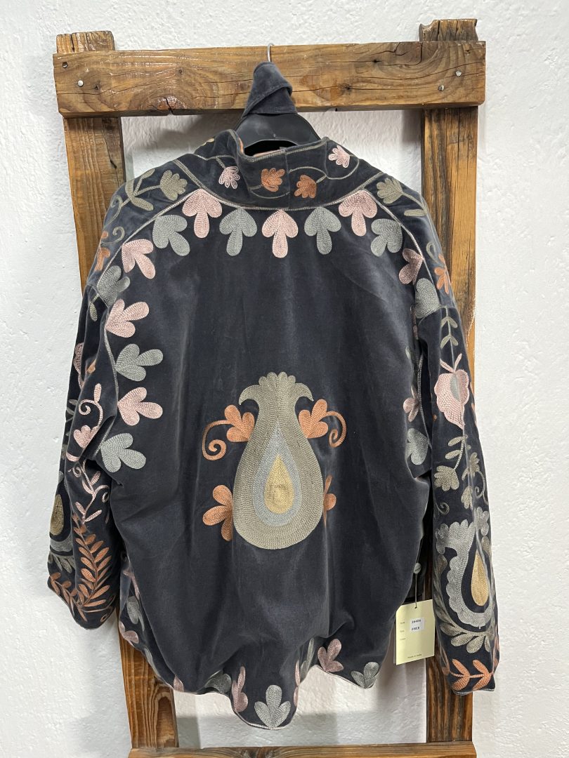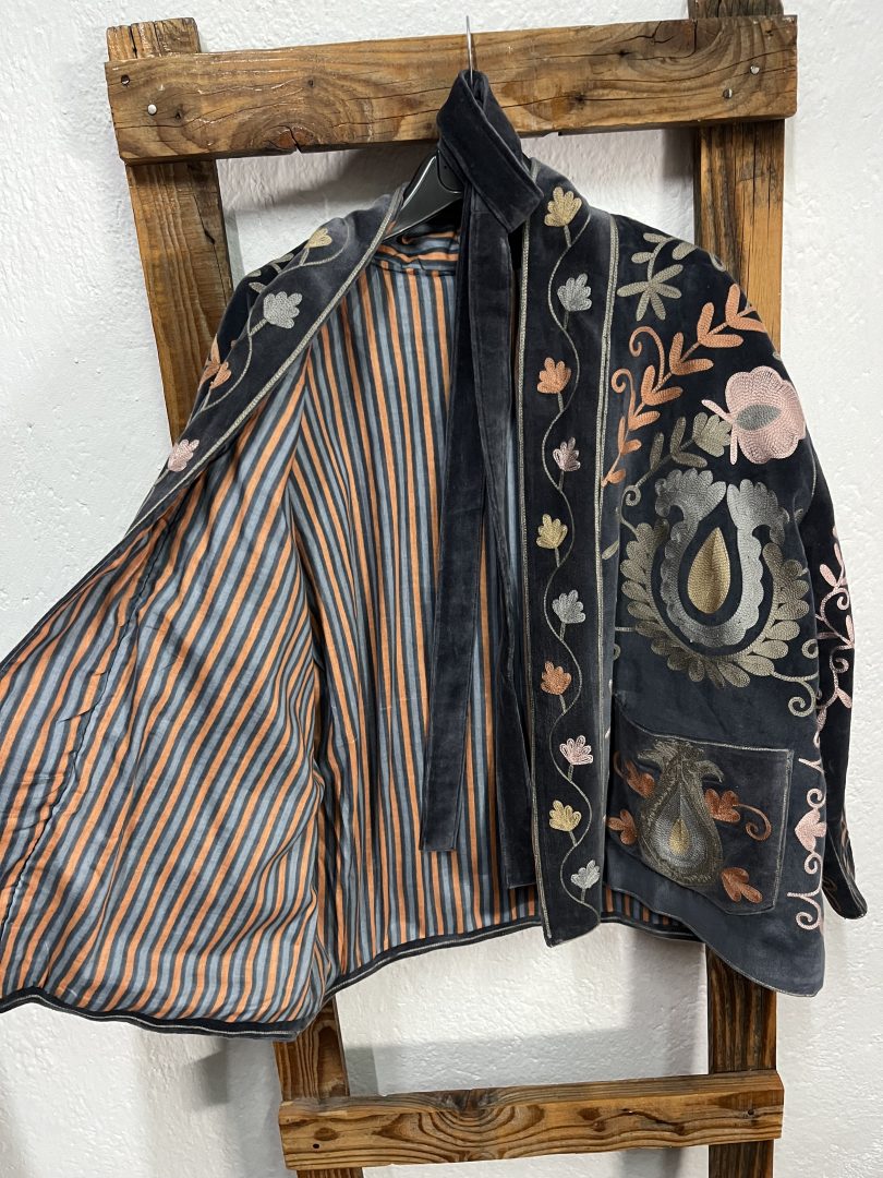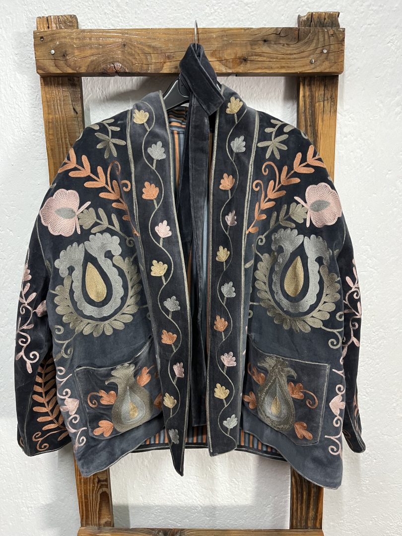 Este kimono de terciopelo gris marengo bordado es una pieza artesanal única confeccionada con bordado completo sobre tejido de alta calidad.