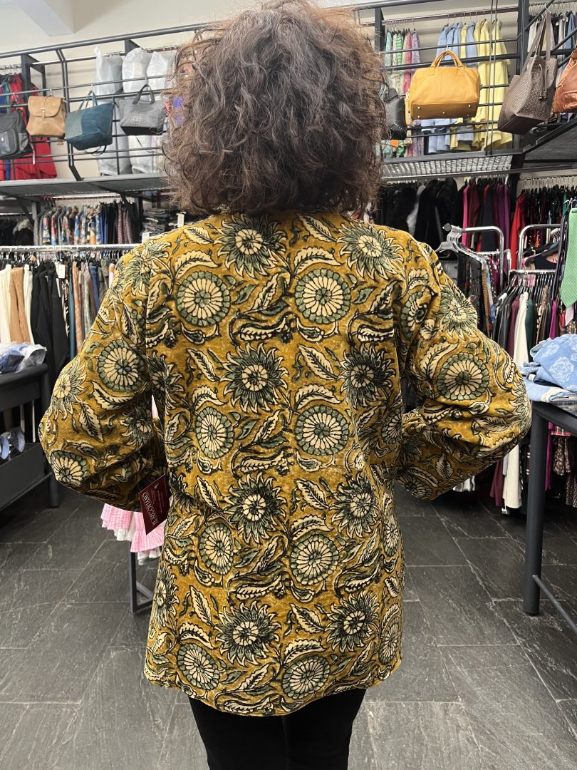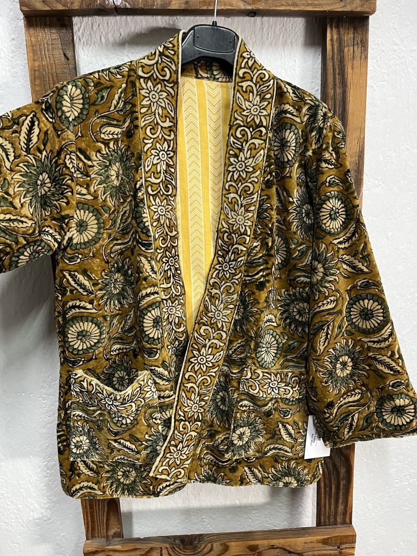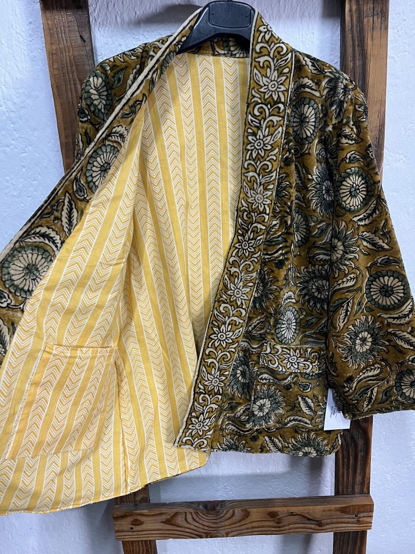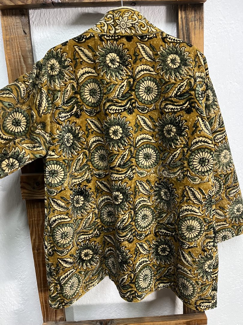 Kimono reversible de terciopelo con elegante estampado floral y bolsillos funcionales en ambos lados.