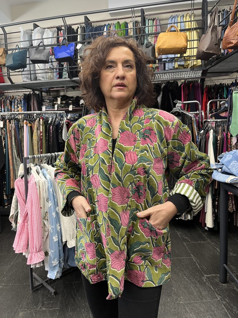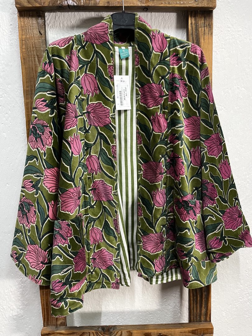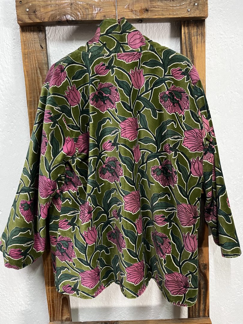 Este kimono reversible de terciopelo permite lucir dos estilos diferentes, manteniendo bolsillos funcionales en ambos lados para mayor practicidad. El verde como color principal aporta frescura y personalidad, mientras que el estampado floral añade un toque distintivo y femenino.