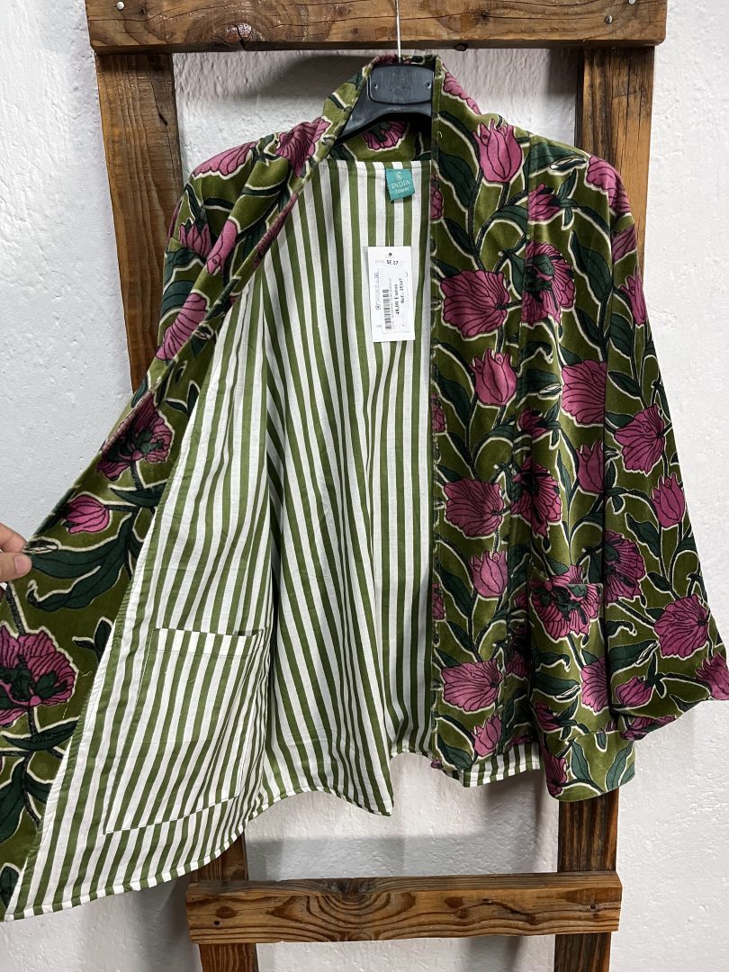 El kimono reversible terciopelo verde estampado floral es una prenda elegante y versátil que combina comodidad y estilo en una sola pieza.