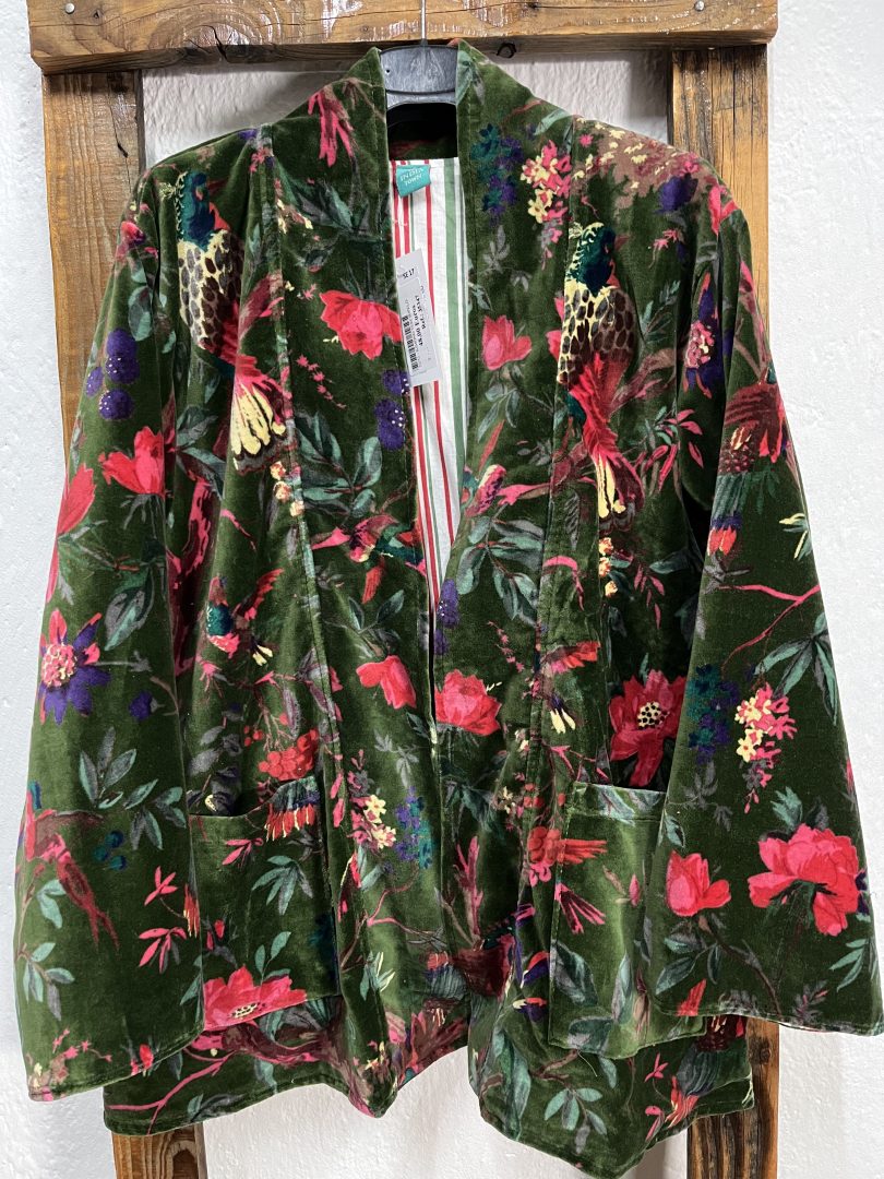 El kimono reversible terciopelo verde estampado floral es una prenda elegante y llamativa que combina comodidad y estilo en una sola pieza.
