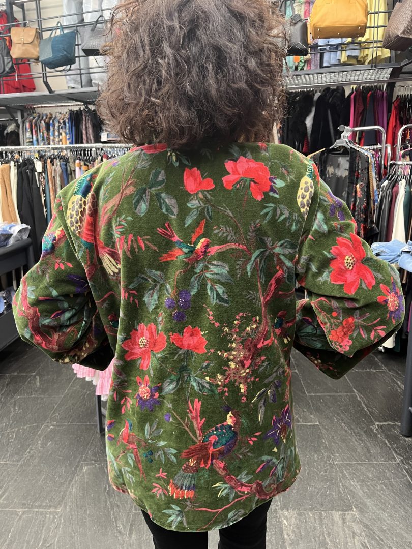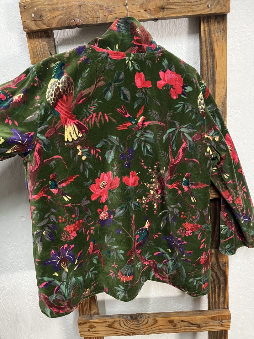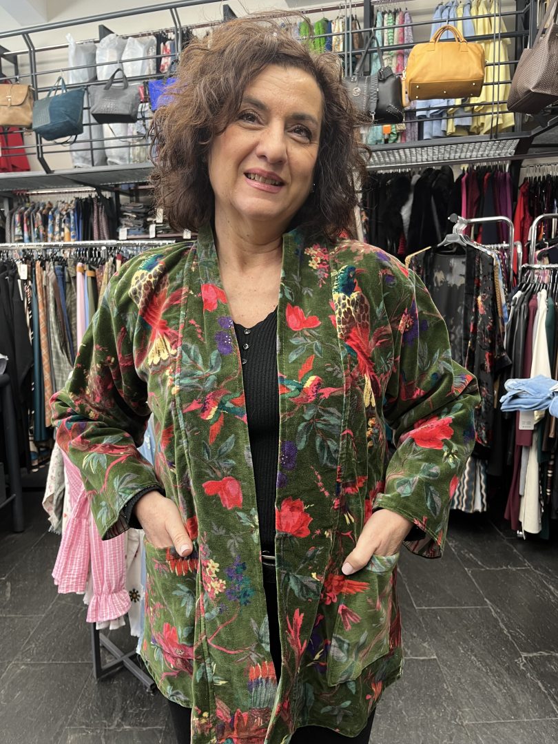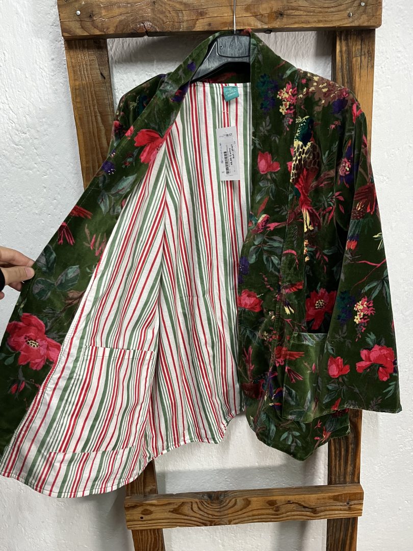 Este kimono reversible de terciopelo ofrece dos posibilidades de uso, manteniendo bolsillos funcionales en ambos lados para mayor practicidad. El verde como color principal aporta frescura y personalidad, mientras que el estampado floral añade un toque sofisticado y diferente.